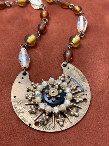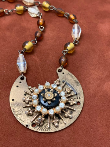 This necklace incorporates rare a perfectly aged pocket watch plate embellished with a beautiful starburst style finding with pearls and crystals. This is a beautiful and very fine contraption.